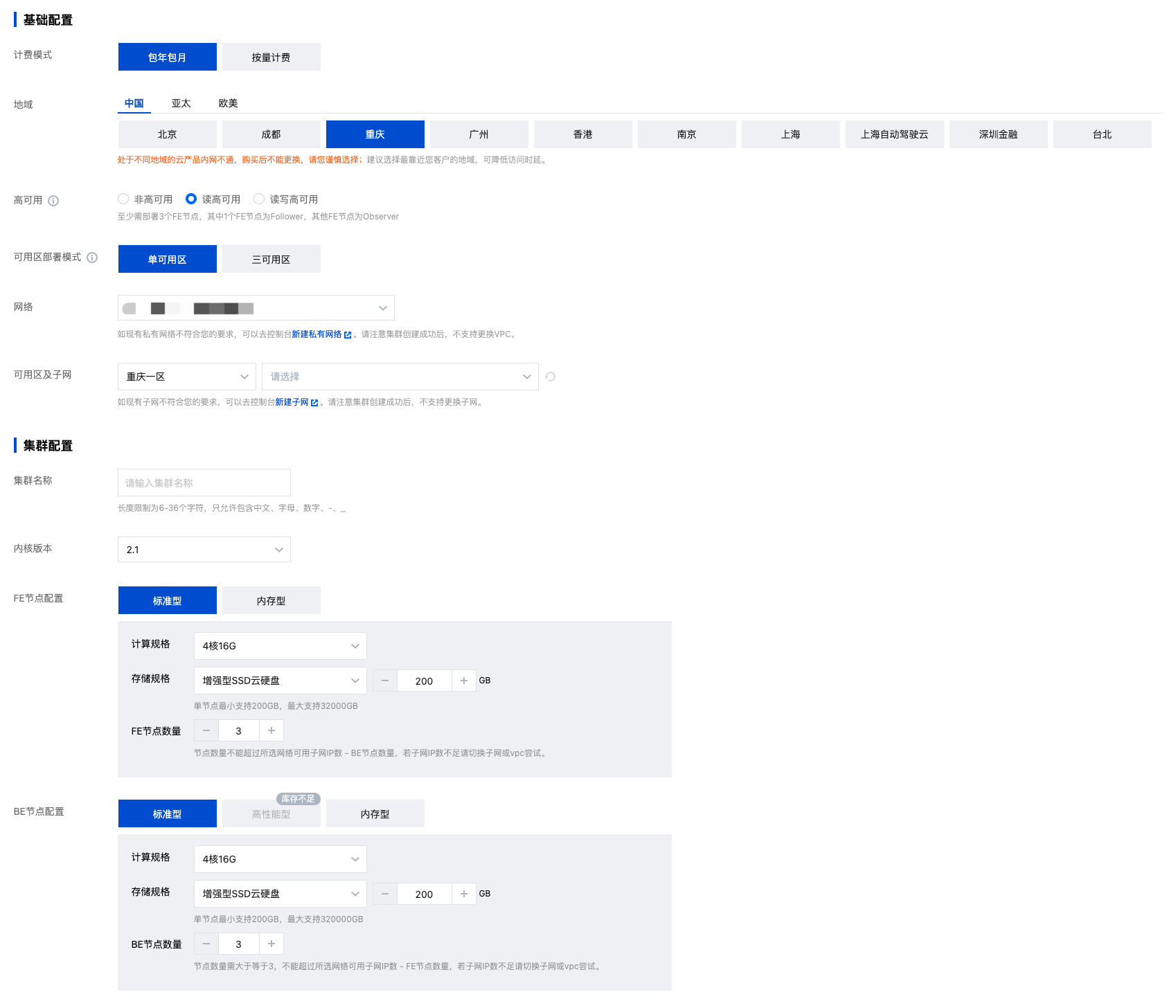 2. 逐项完成基础配置、集群配置、日志配置等配置的选择后,系统将展示相应的配置费用,单击立即购买可实现集群创建。