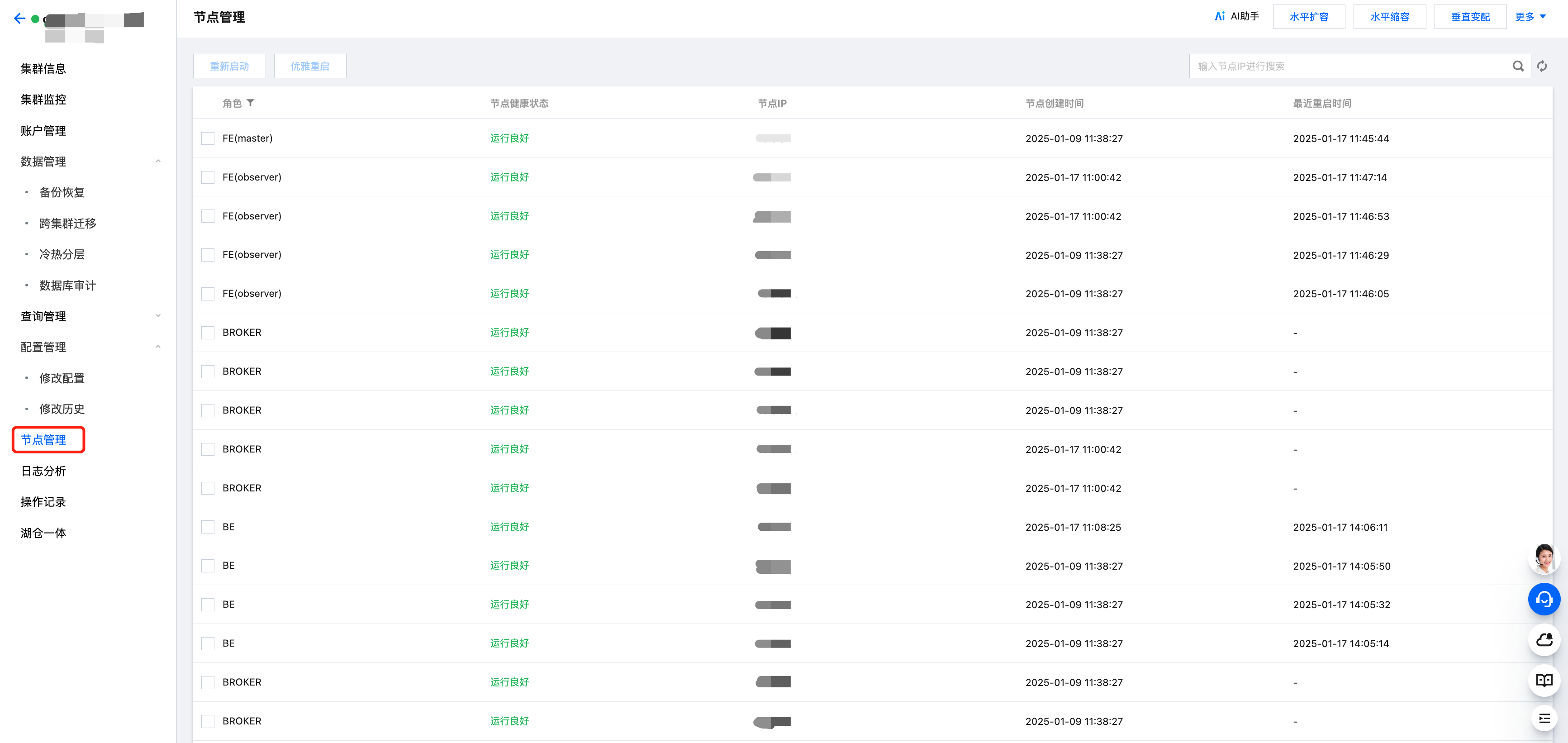节点管理页面展示集群中各角色的状态列表,角色包含 FE、BE、BROKER。对每个角色,会展示健康状态、进程状态、节点IP及最近重启时间(在角色管理页面最后一次手动进行服务重启操作的时间)。