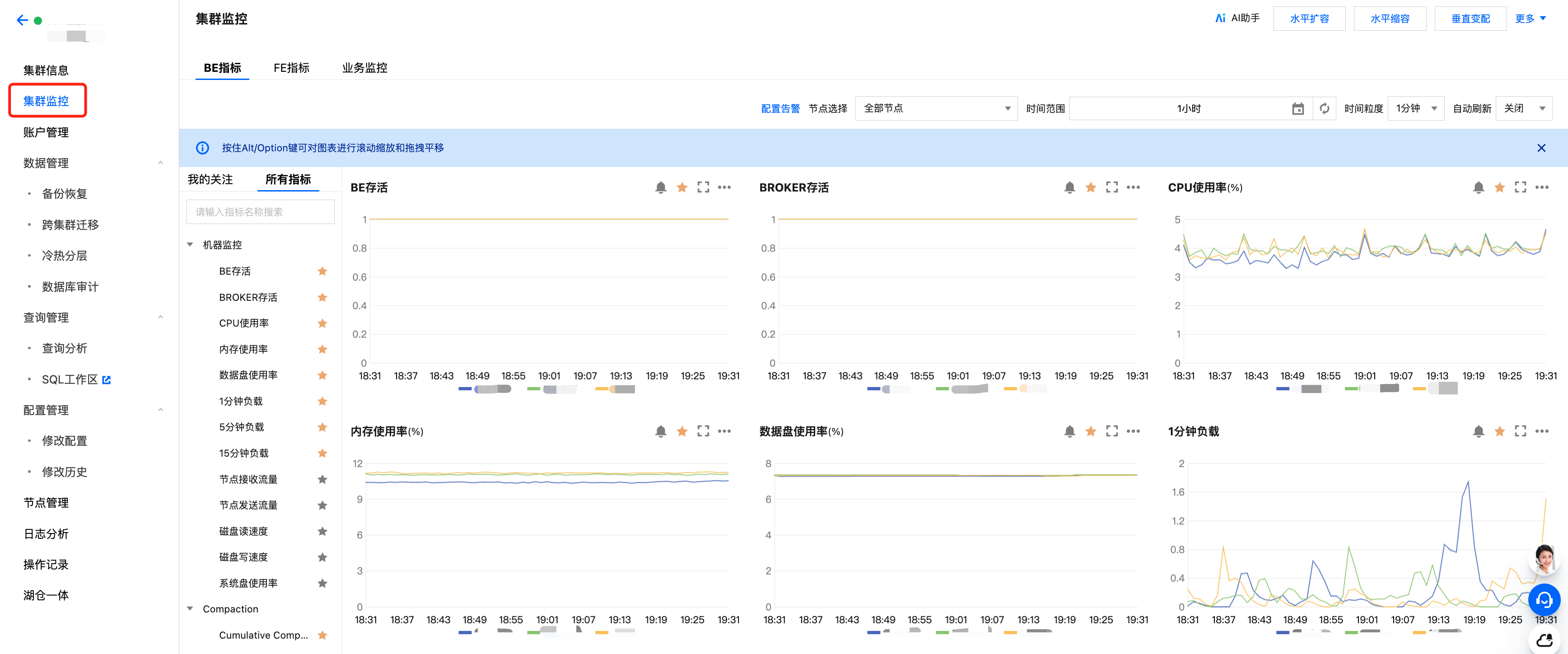 腾讯云数据仓库 TCHouse-D 提供了丰富的监控指标,方便您掌握集群的运行状态,并可针对指标配置告警以实时关注运行信息,实现快速响应。单击集群 ID/名称进入集群详情页,单击集群监控可查看集群的各项性能指标。