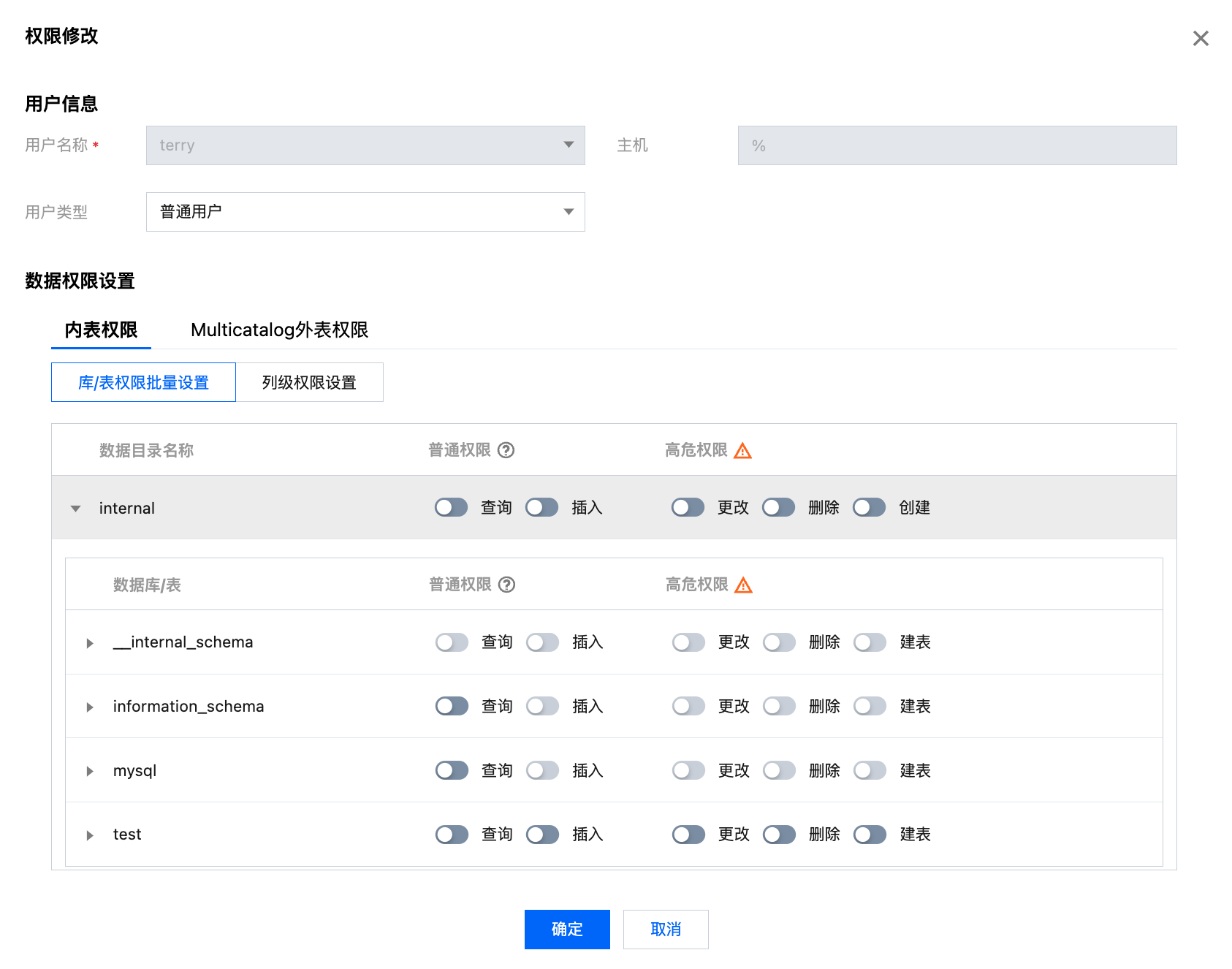 单击新增账户按钮,填写数据库账户、密码、确认密码和描述(选填),单击确定即可新增账户。单击修改权限可进到权限修改窗口,该窗口也可用来查看权限。