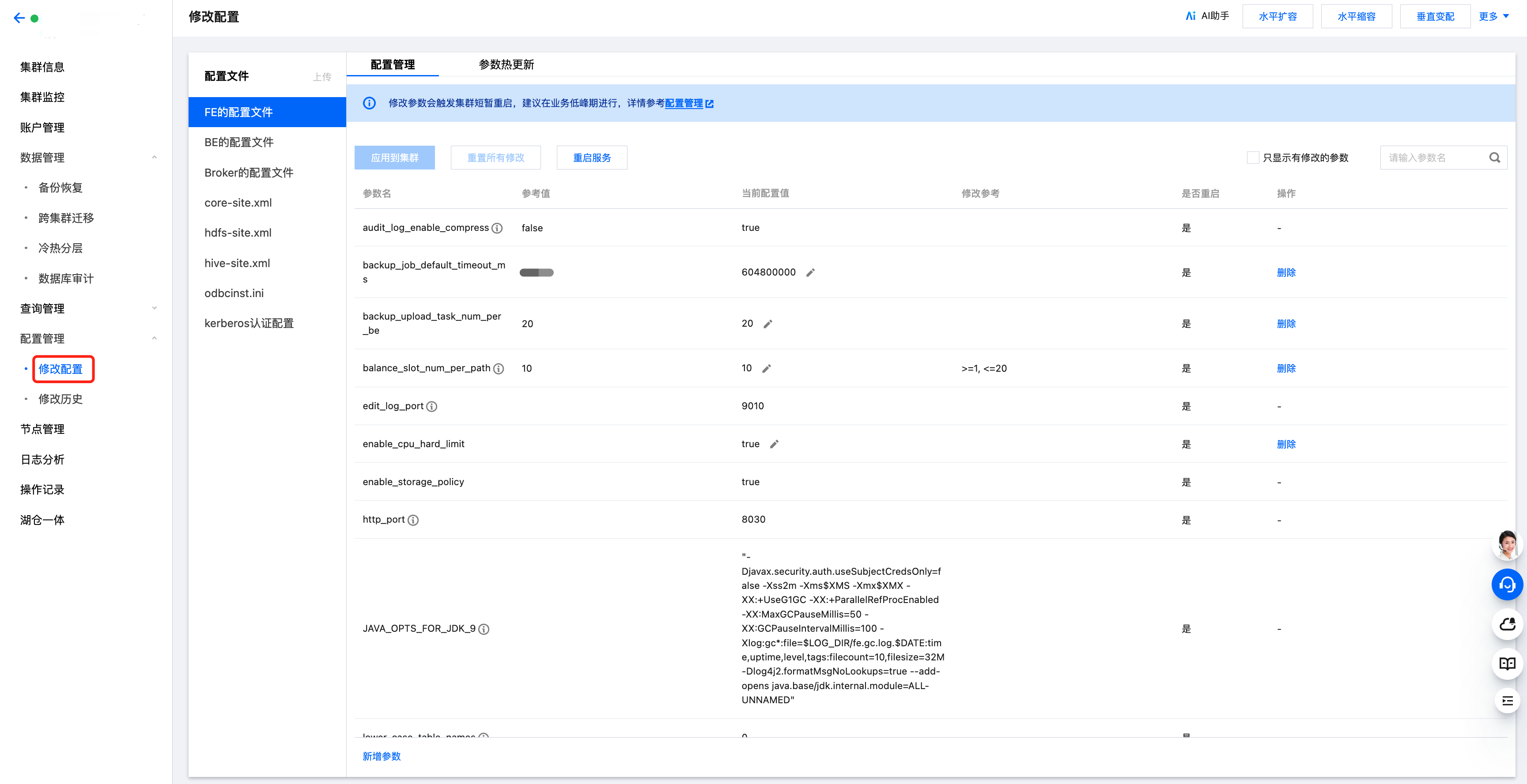 针对 Broker、BE、FE 对应的配置参数,支持配置文件修改、参数热更新。针对 XML 配置文件支持整文件修改。