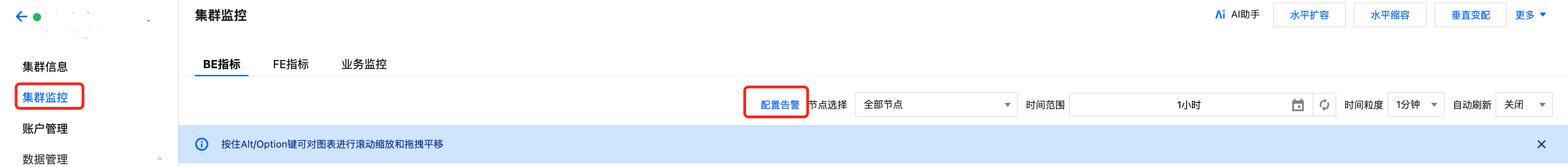 支持创建灵活全面的报警策略,可以对所有监控指标进行异常告警。在集群监控页面内,单击配置告警可新建告警策略。