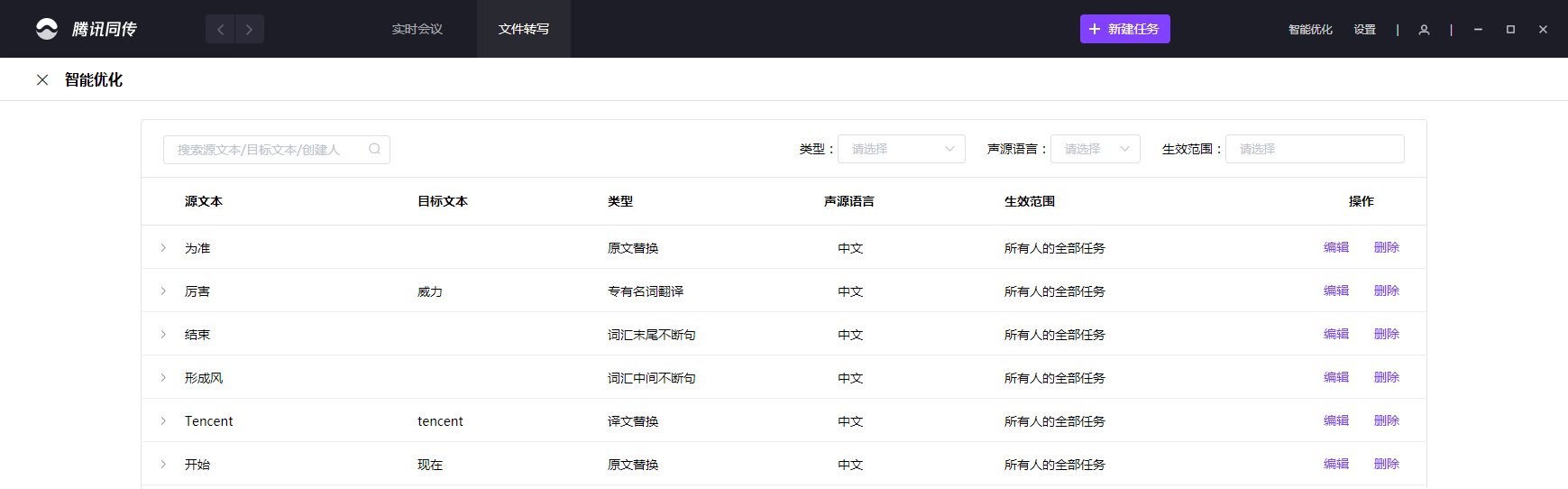 在系统使用过程中,针对通用型的专有名词、网络热词、人名、地名、产品名、缩写简写等,系统提供了优化功能,可根据需要进行预先定制优化,能有效提升识别准确率和翻译准确率。优化功能包括翻译修正、文本优化、专有词汇识别。