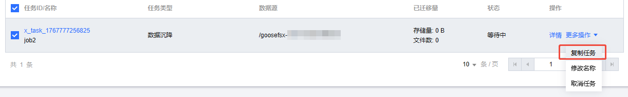 4. 在单次任务列表,选择目标任务,或通过条件过滤筛选目标任务,单击更多操作 >复制任务操作。