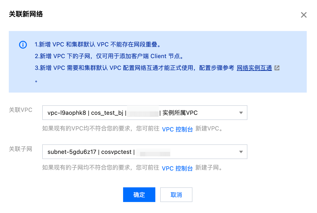 4. 在基本信息 > 网络配置中,单击关联新网络,选择关联 VPC 和关联子网。当前支持跨 VPC 关联子网。