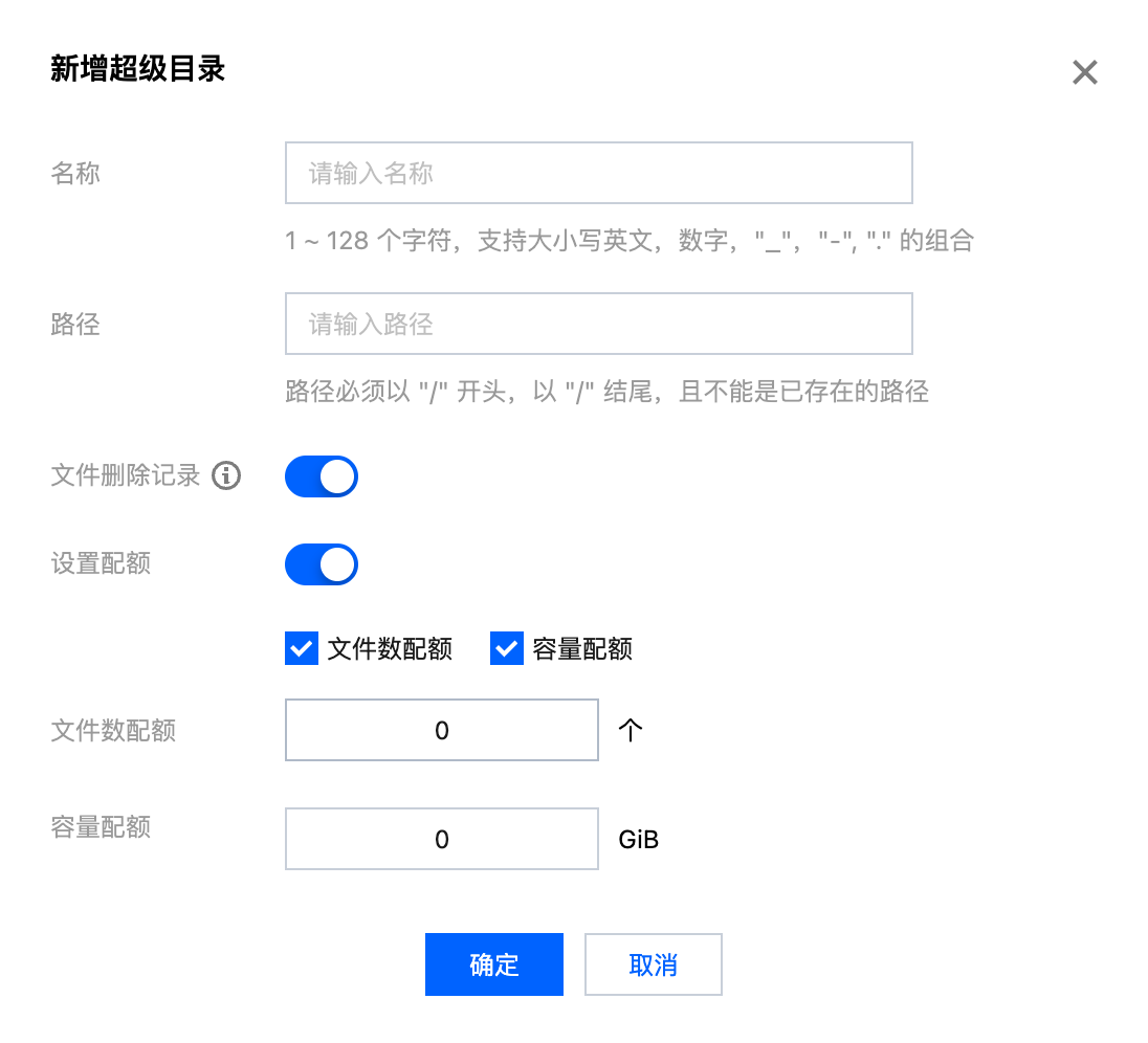 名称:超级目录的名称,请先确定好名称,创建后不支持修改。命名规范如下:1 ~ 128 个字符,支持大小写英文、数字、“_”、“-”、“.”的组合。