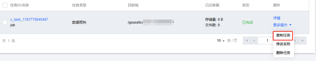 4. 在单次任务列表,选择目标任务,或通过条件过滤筛选目标任务,单击更多操作 > 复制任务操作。