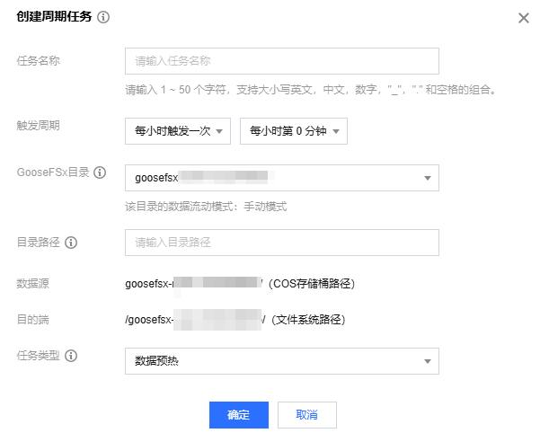 周期任务,周期性自动触发执行,例如,每间隔1小时自动预热,将从 COS 预热数据到 GooseFSx,适用于及时同步 COS 存储桶的数据变化等场景。