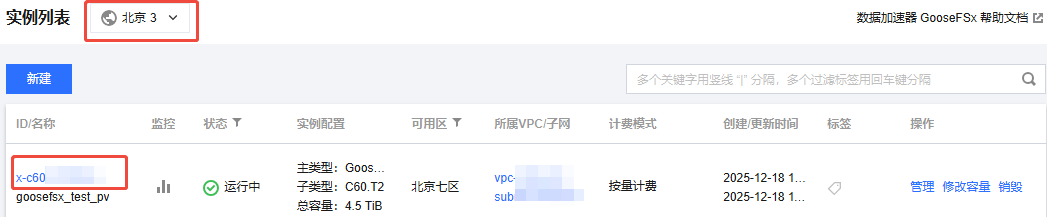 2. 选择地域,选择目标 GooseFSx 实例。可通过可用区、状态、类型等快速找到目标实例,或者通过名称关键字模糊匹配搜索出目标实例。