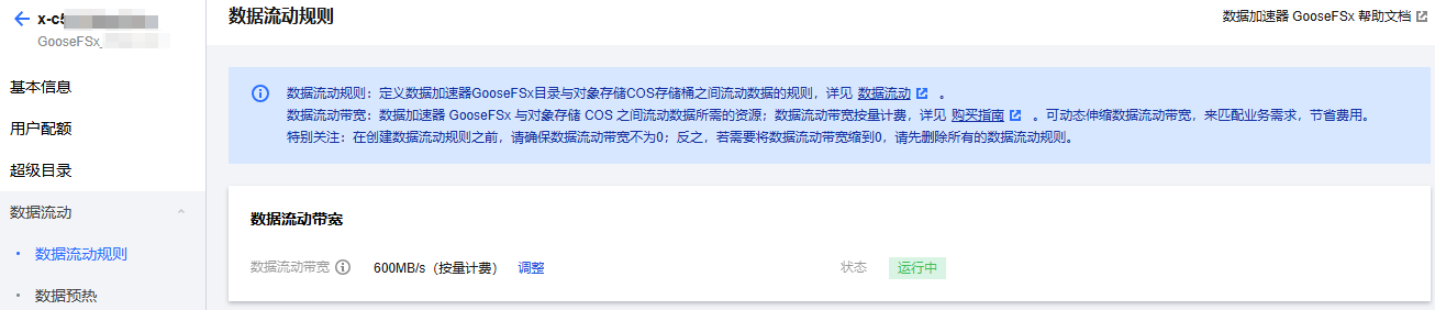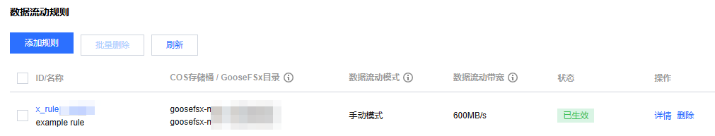 3. 单击实例 ID 或者管理,选择数据流动 > 数据流动规则。可查看名称、COS 存储桶、GooseFSx 目录、数据流动模式、数据流动带宽等详细信息。