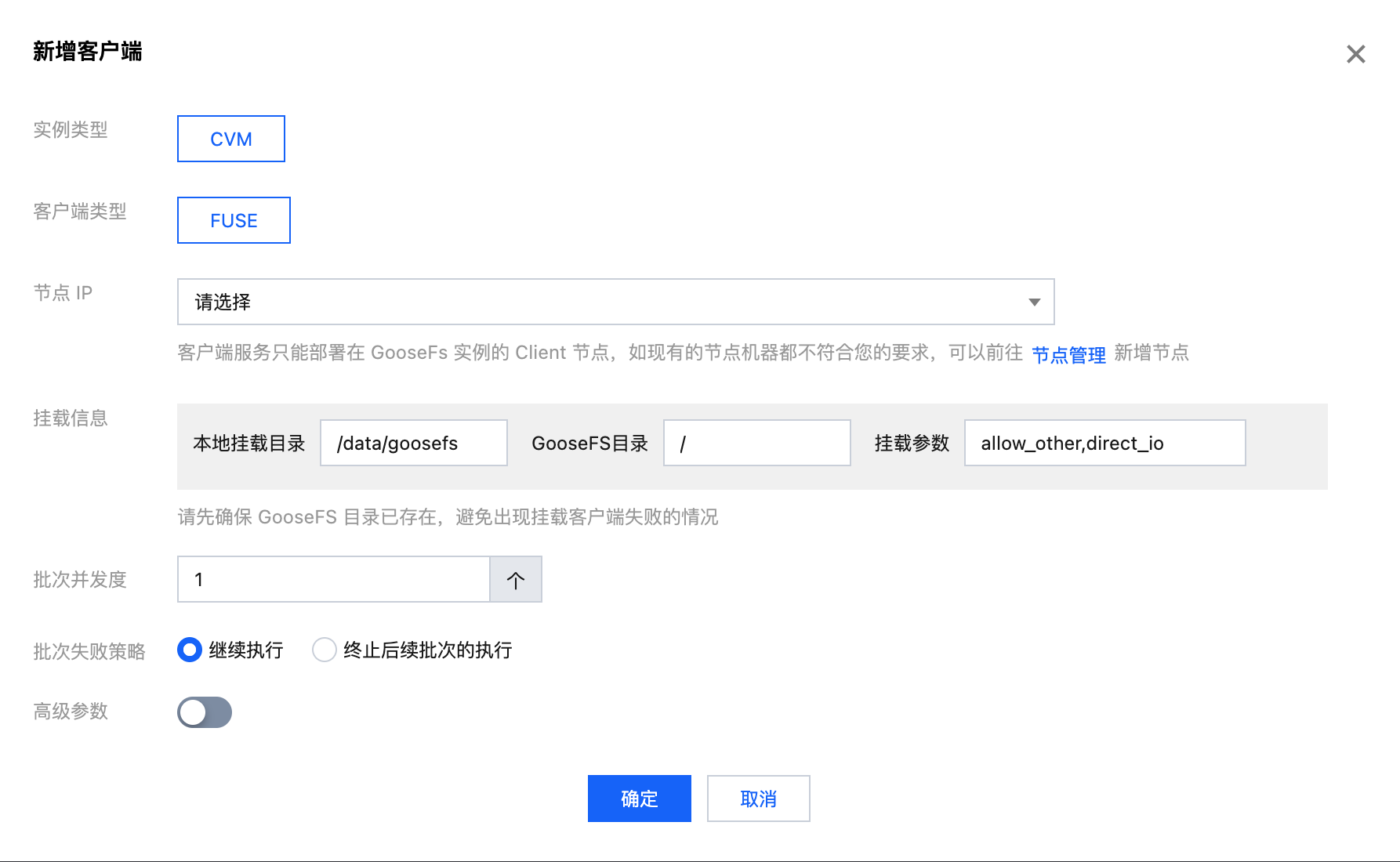 新增客户端:用于在一个指定节点中部署 GooseFS 客户端,可以配置如下参数,配置完成后单击确定即可。