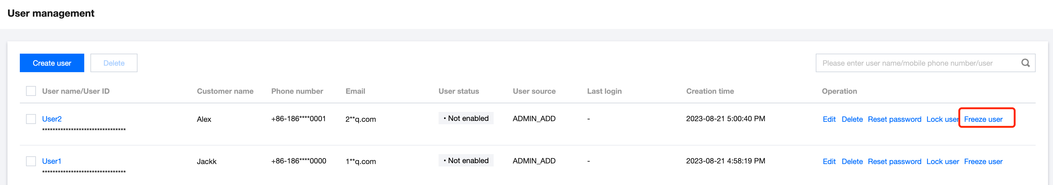 2. On the User Management page, click Freeze User in the operation column. A "Confirm Freeze" pop-up window will appear.