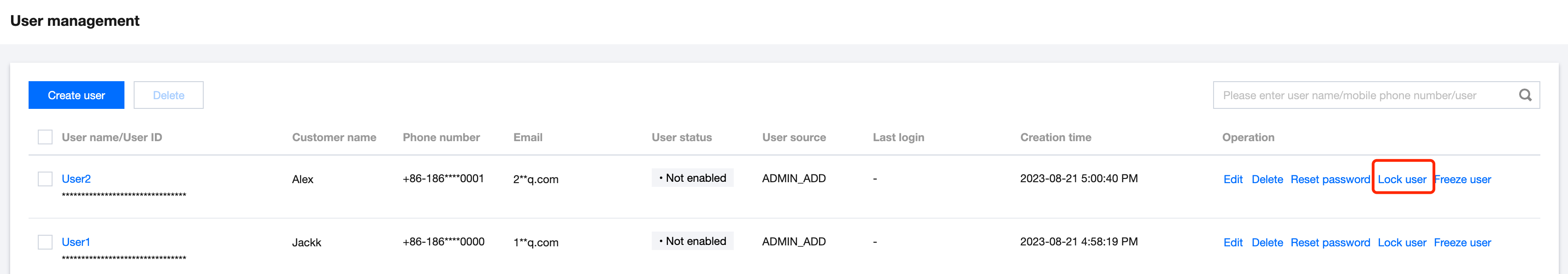 2. On the User Management page, click Lock User in the operation column. A "Confirm Lock" pop-up window will appear.