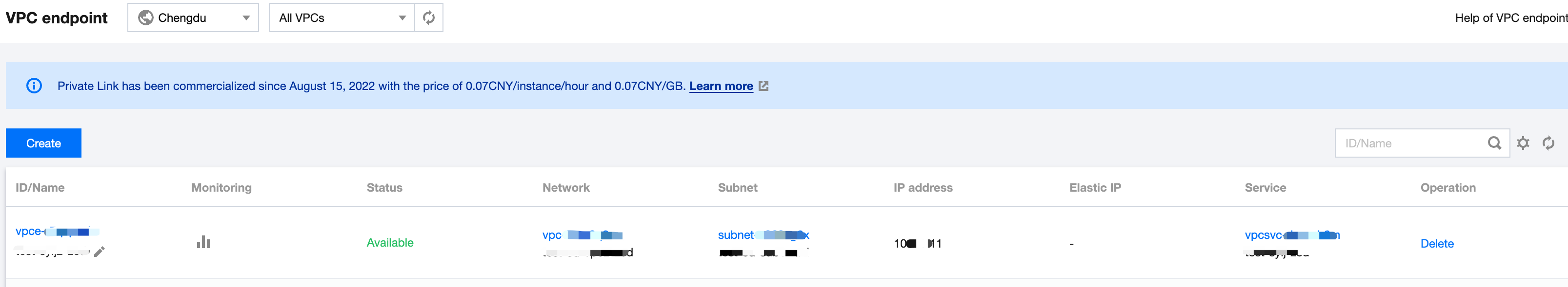 When Yes is selected for automatic acceptance, the Endpoint Service will accept all connection requests from Endpoints by default. After the Endpoint is created successfully, its status will be Available.