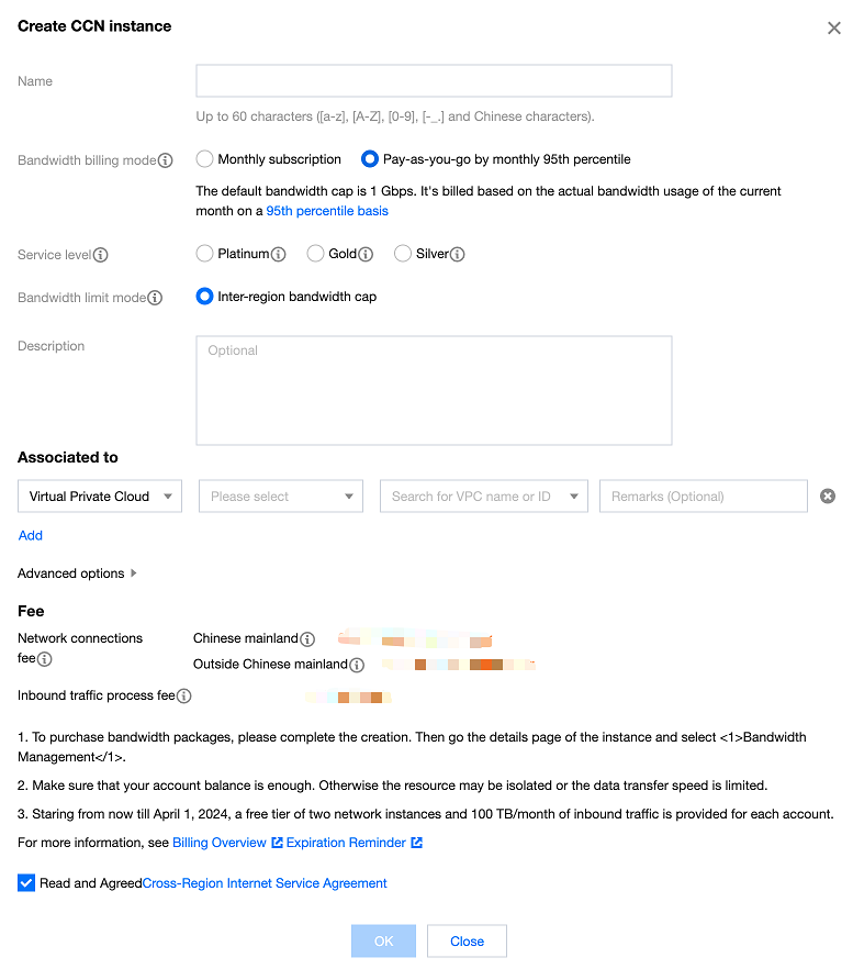 2. Click Create to create a Cloud Connect Network instance, associate cross-regional VPC1 and VPC3, and click Confirm to enable interconnectivity between VPC1 and VPC3.