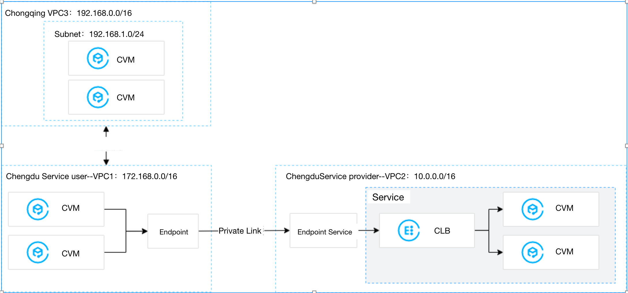A Virtual Private Cloud (VPC) is your exclusive cloud-based network, and different VPCs are completely isolated by default. You can use Private Link service to establish secure and stable connections between Tencent Cloud VPCs and other VPCs in the same region, simplifying network architecture and avoiding potential security risks associated with public network access. If you need to share VPC services across regions, you can use Cloud Connect Network to enable cross-regional VPC communication, and then use the Private Link service with the endpoint in the consumer VPC to access services in the provider VPC.