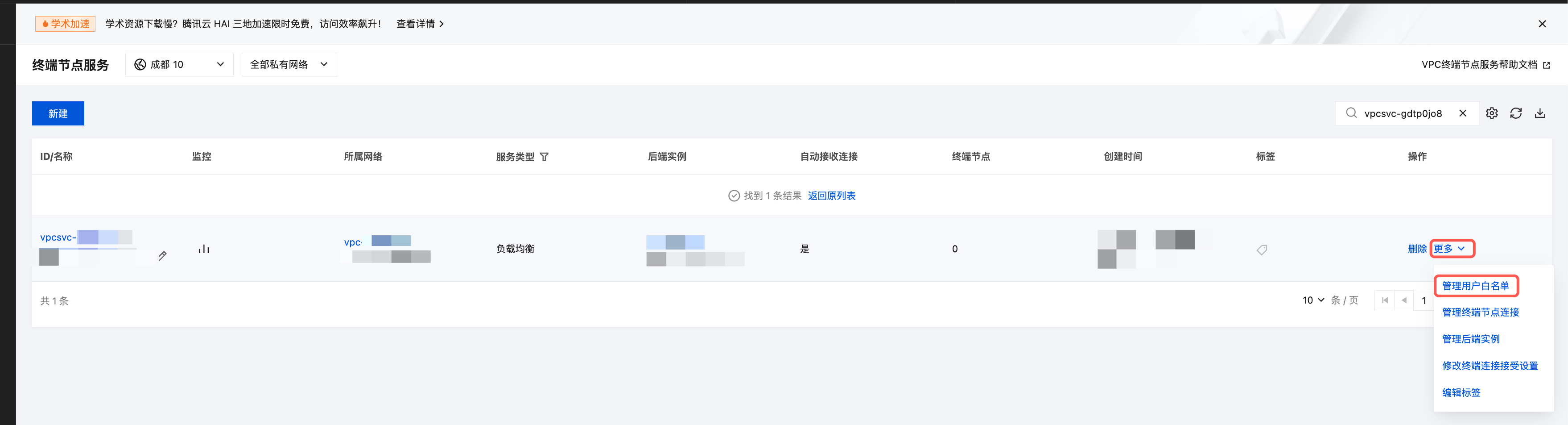 3. 单击某终端节点服务右侧的更多 > 管理用户白名单,或单击终端节点服务 ID 进入详情页,再进入白名单页签。