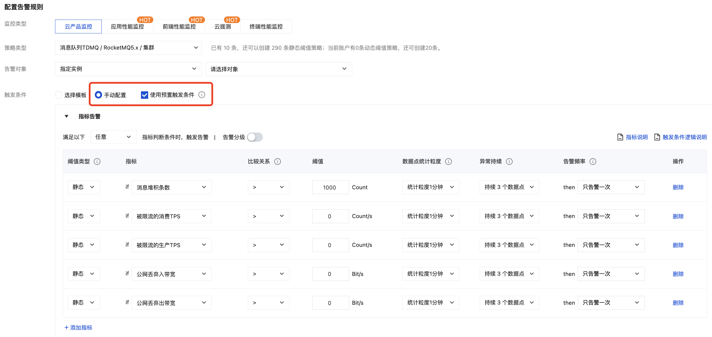 3. 触发条件保持默认的手动配置,勾选使用预置触发条件,会出现如下图所示的系统预置告警触发条件,您可以根据这些默认策略快捷配置告警规则。