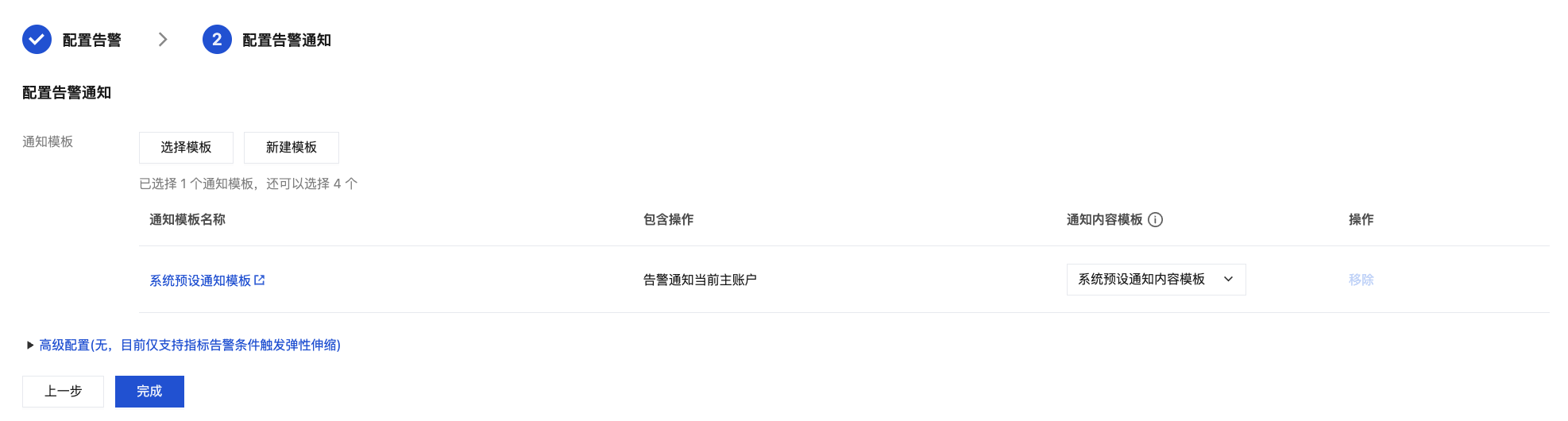 4. 单击下一步:配置告警通知,配置告警通知人。