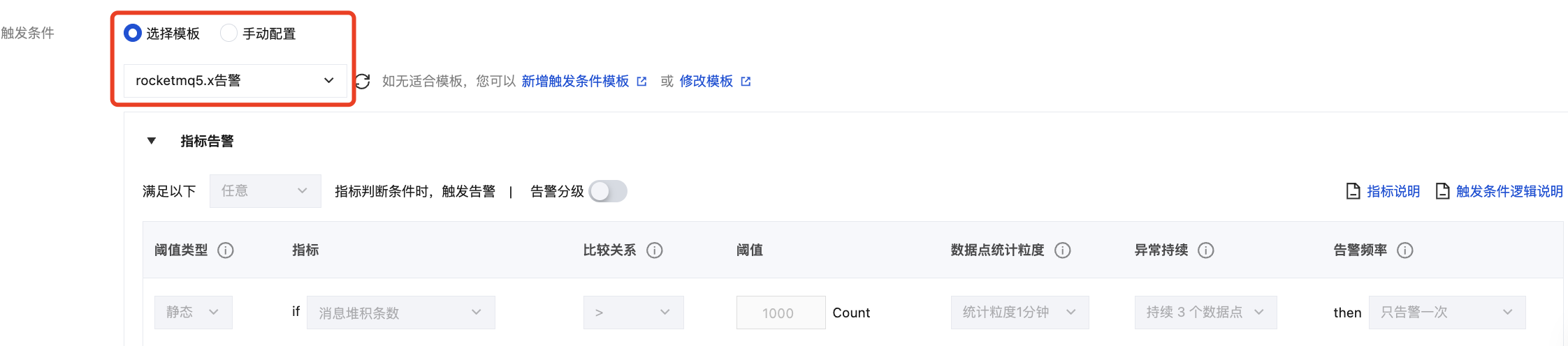 3. 设置告警触发条件,支持选择模板和手动配置,默认选择手动配置。