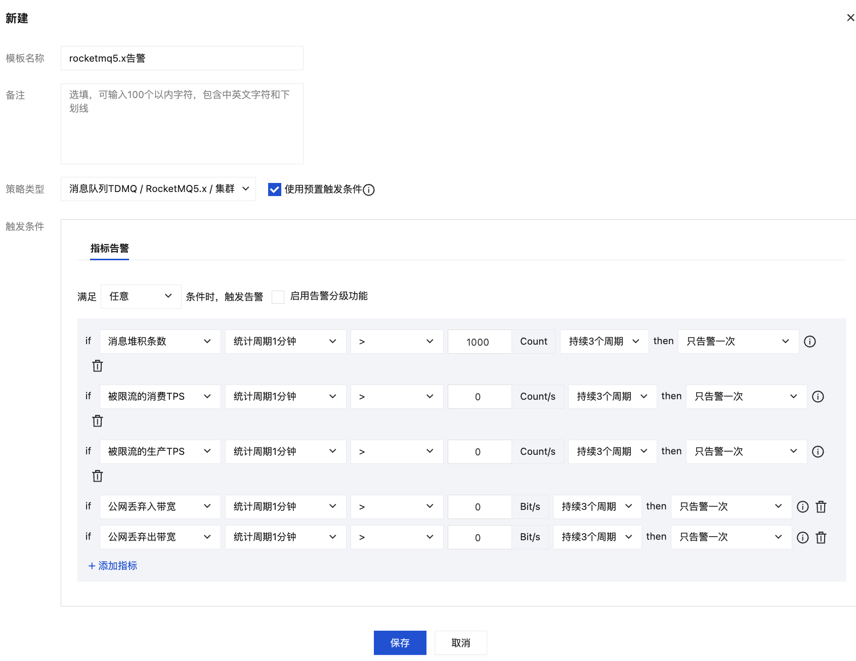 入口二:登录腾讯云可观测平台控制台,在告警配置页面可以查看所有预设策略和自定义策略,单击新建策略,监控类型选择云产品监控,策略类型选择消息队列TDMQ,5.x 集群请选择 RocketMQ5.x,4.x 集群请选择 RocketMQ4.x。