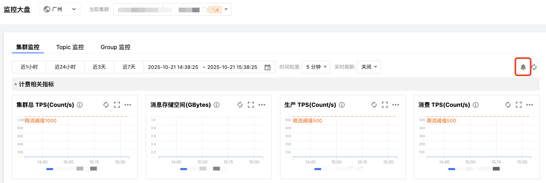 入口一:登录TDMQ RocketMQ 版控制台,在监控大盘页面,单击监控图表右上角的配置告警按钮可以跳转到告警配置页面,页面默认设定的告警对象是跳转前监控图表对应的集群。