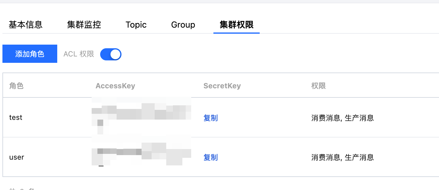 accessKey | 角色密钥,在控制台的集群权限页面 AccessKey 列复制。 ![]() |