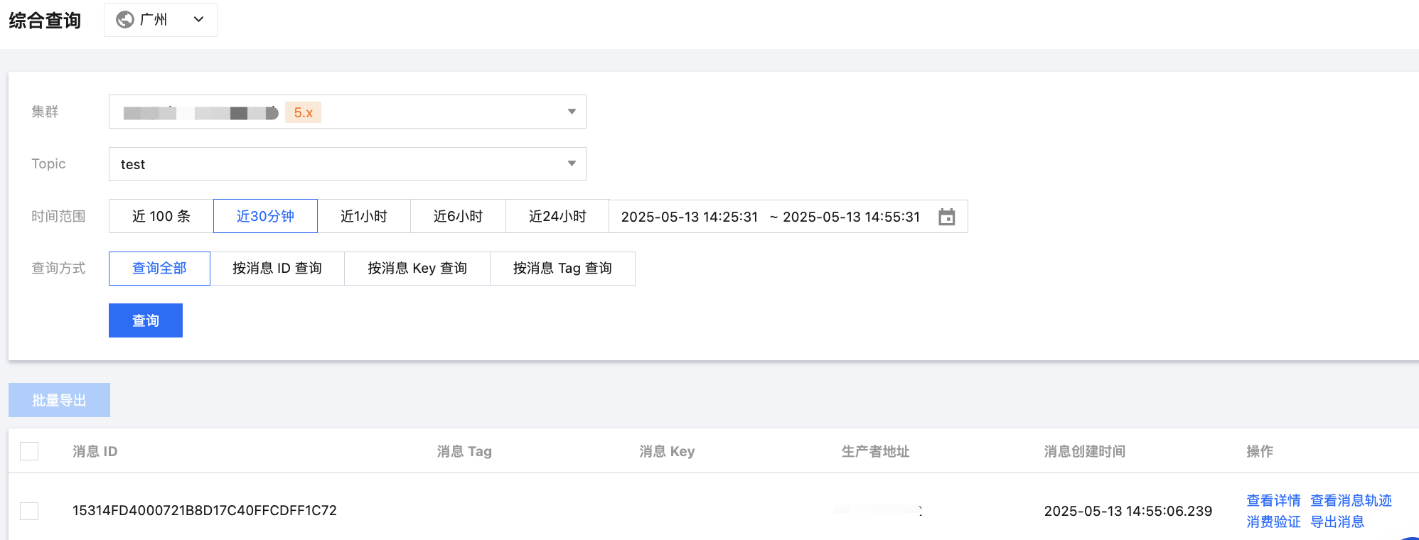 1. 登录 RocketMQ 控制台,在左侧导航栏单击消息查询 > 综合查询。