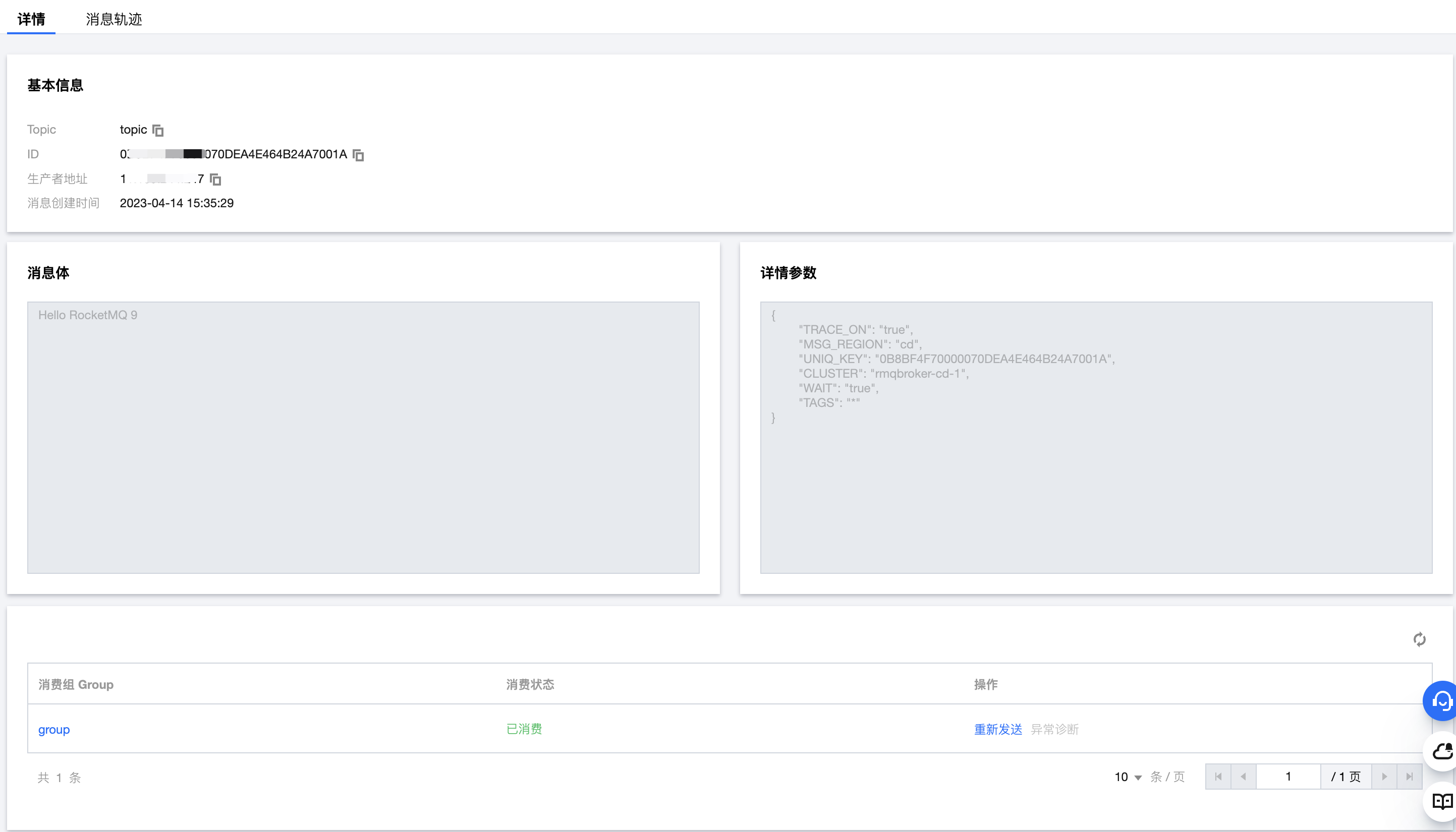 4. 找到您希望查看内容或参数的消息,单击操作列的查看详情,即可查看消息的基本信息、内容(消息体)、详情参数和消费状态。