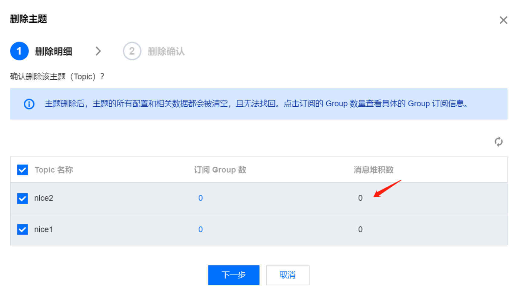 4. 在弹出的提示框中,控制台会对当前 Topic 的订阅 Group 和消息堆积数进行校验,确认无误后,单击删除即可。