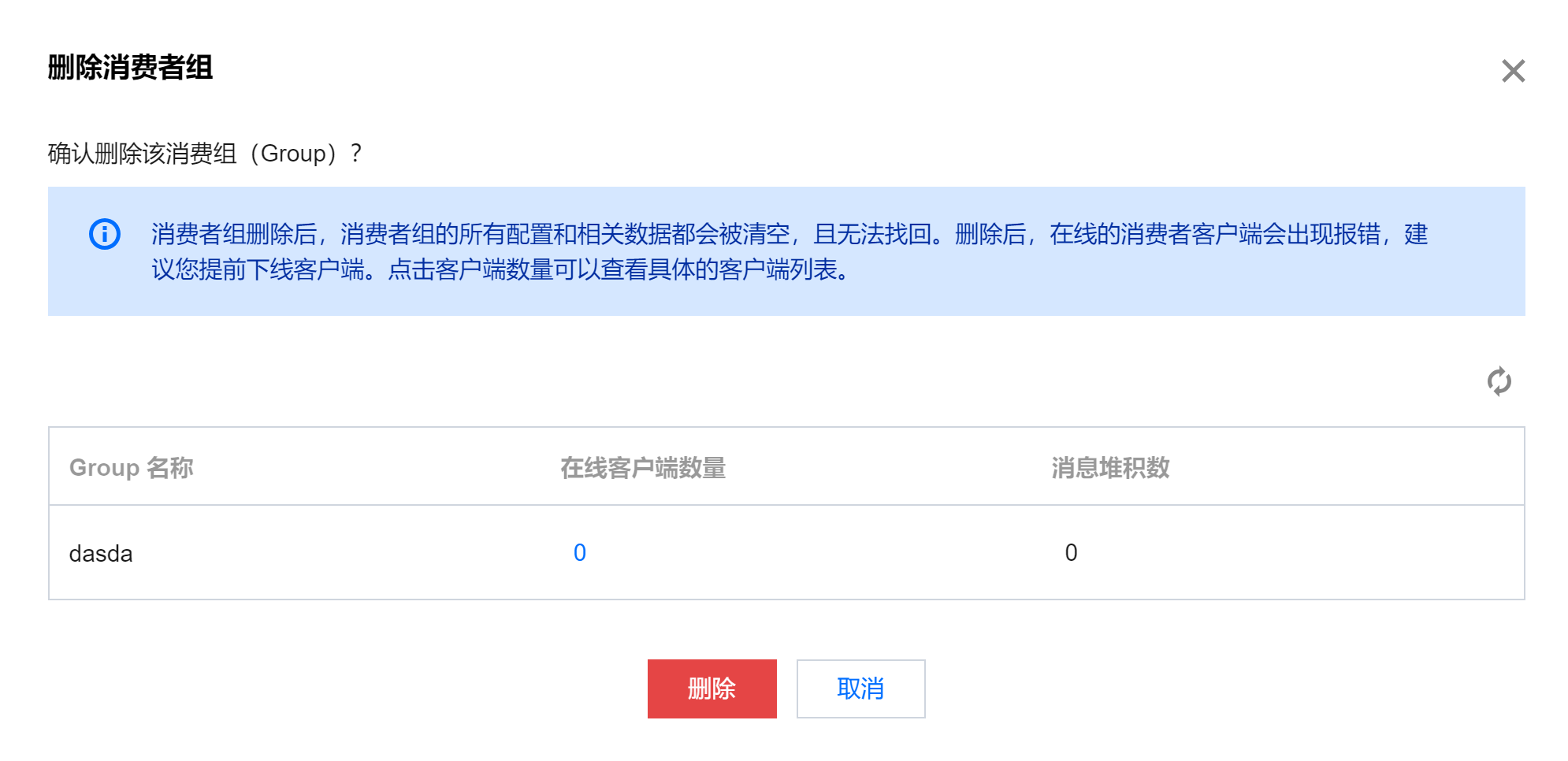Group 删除后,Group 的所有配置和相关数据都会被清空,且无法找回。删除后,在线的消费者客户端会出现报错,建议您提前下线客户端。