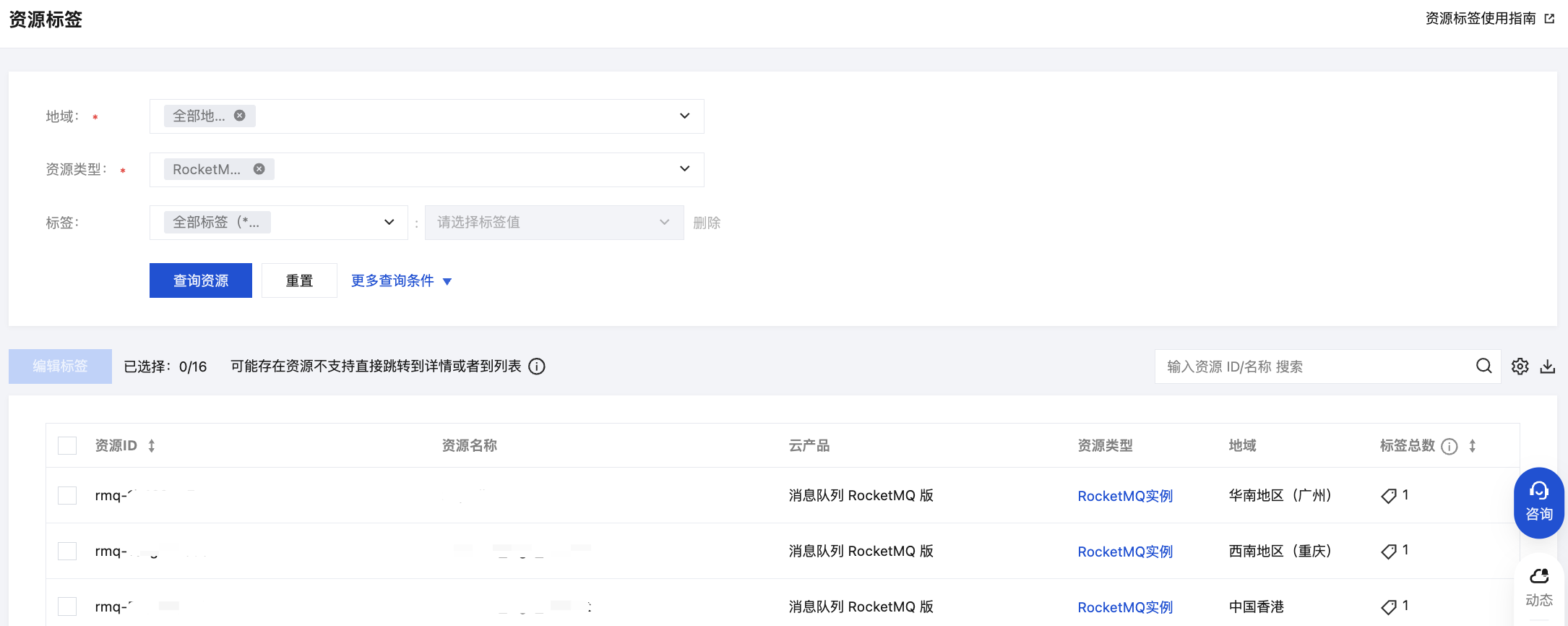 2. 在左侧导航栏选择资源标签,选择好地域,并在 资源类型 中选择 消息队列 RocketMQ 版。