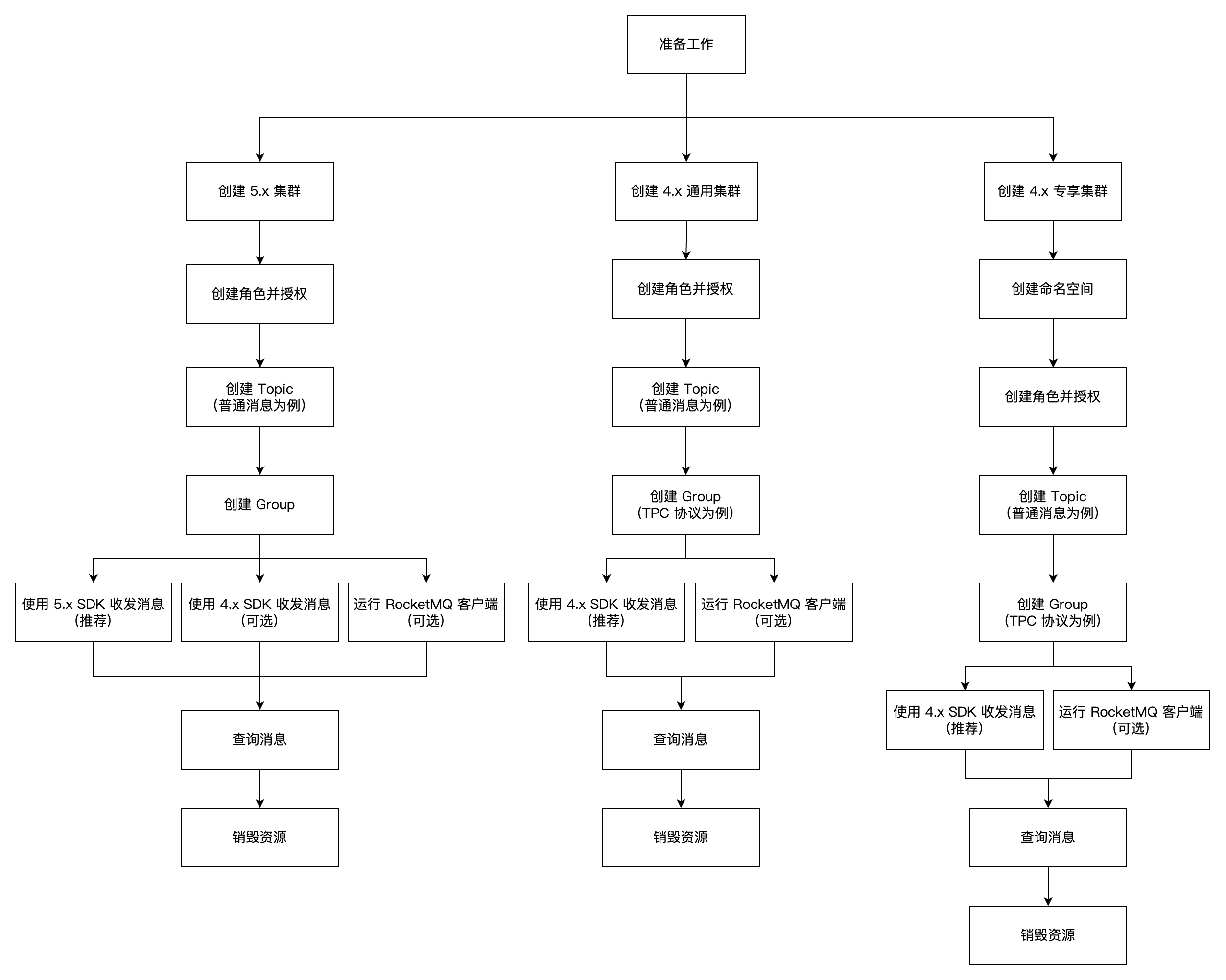 根据集群类型的不同,快速入门的操作流程也有所差异,使用消息队列 RocketMQ 版收发消息的流程如下图所示。