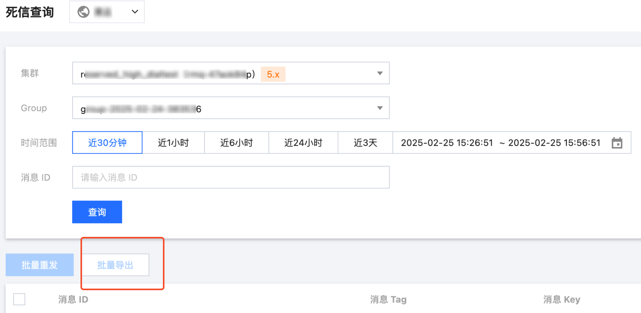 不填写消息 ID:属于模糊查询。根据 Group ID 和死信消息产生的时间范围,批量查询该 Group ID在某段时间内产生的所有死信消息。