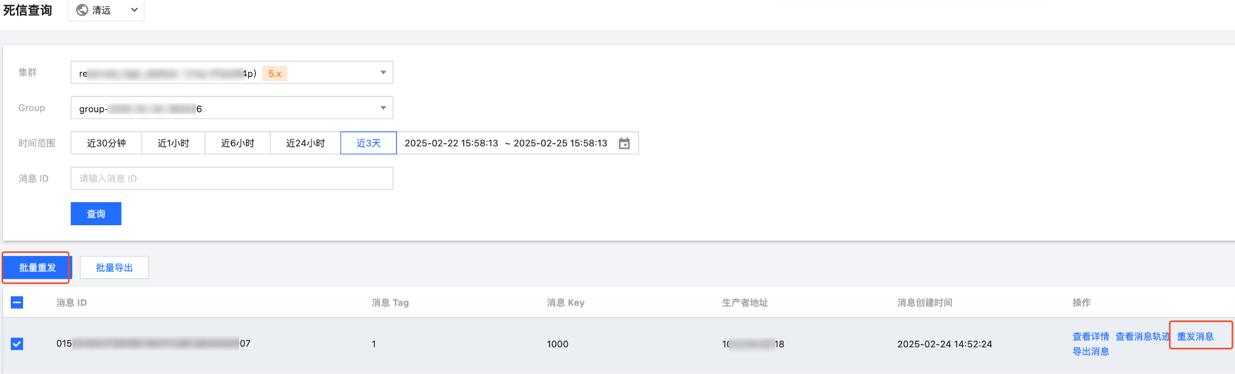 您可以勾选多条死信消息后单击左上角的批量重发消息将死信消息批量重新发送到原队列的重试队列,也可以单击某条消息操作列的重发消息将单条死信消息重新发送。死信消息在被重新发送后,服务端会将这些消息投递到原队列的重试队列,可以被正常消费,且不会在死信队列中被立即删除,在达到消息生命周期(3天)后才会被删除。
