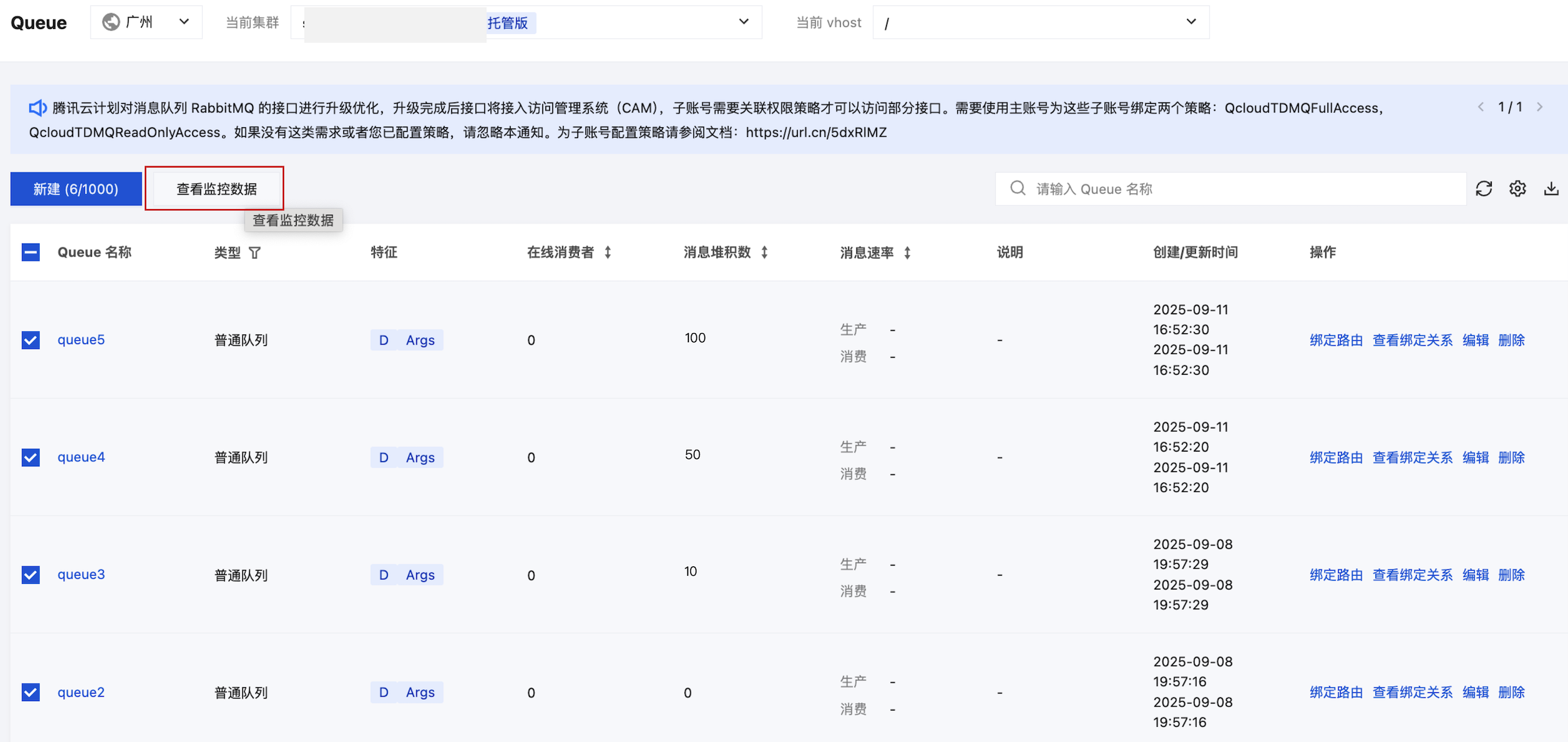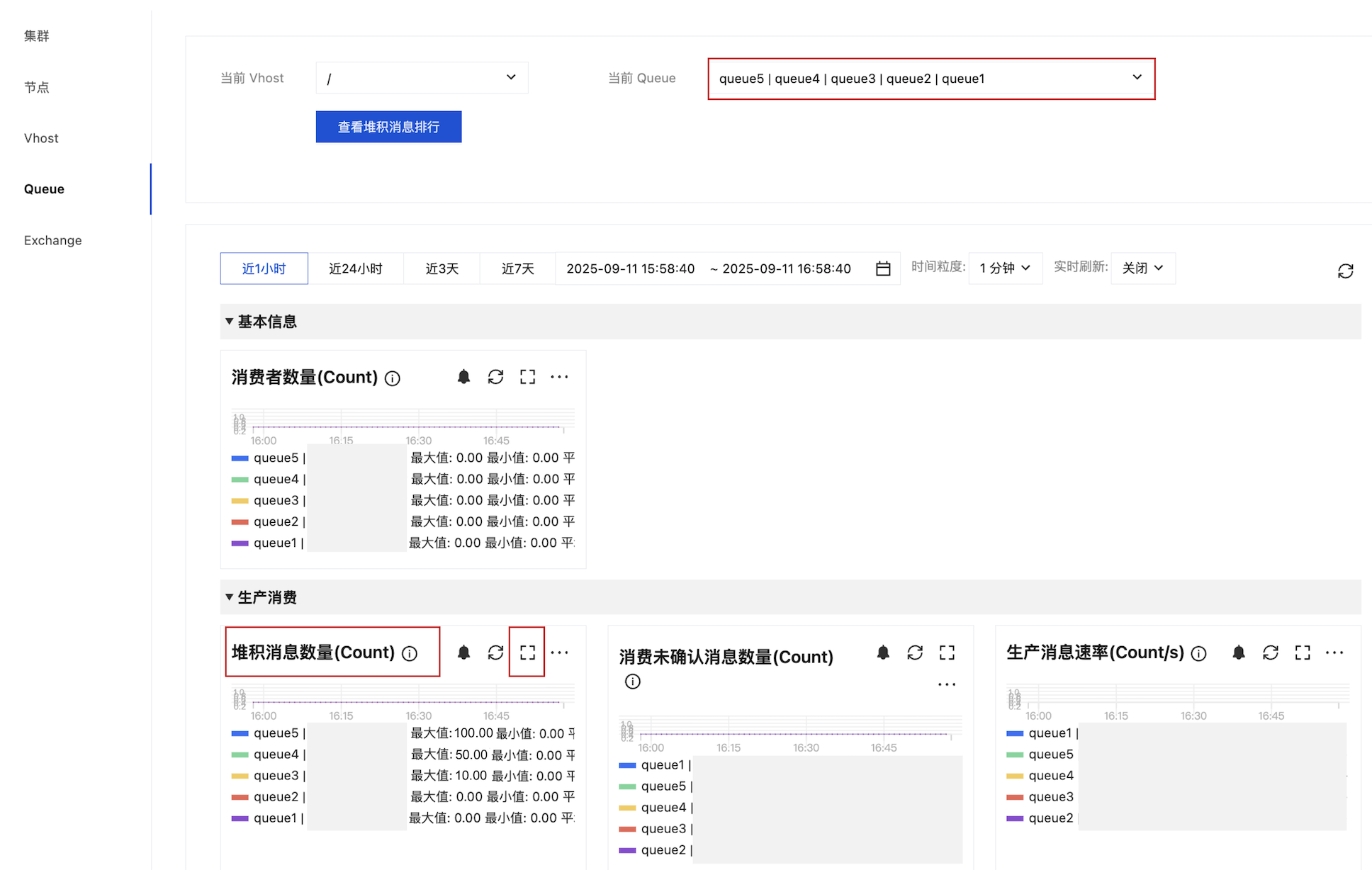 查看 Queue 的消息堆积排行及监控数据的方式如下: