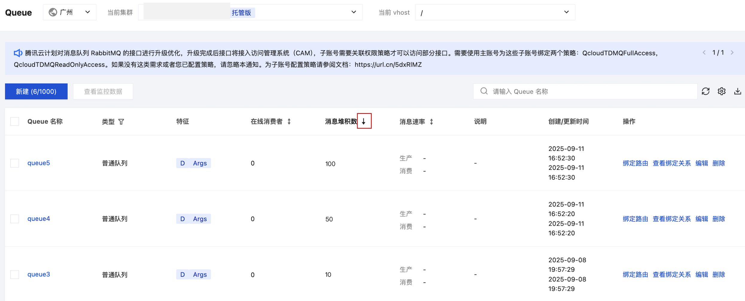 2. 在 Queue 列表页面,可以单击表头的消息堆积数来查看 Queue 的消息堆积排行,支持升序或降序。