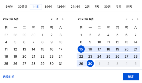 时间范围选择 | ![]() ![]() | 时间选择框,单击可选择图表展示的监控时间范围,默认选取近一小时内数据。 通过上方时间值可以快速选择指定时间区间。 通过日历可以选择大范围时间段。 通过左下角“选择时间”可以进一步选择精确到秒的时间范围。 |