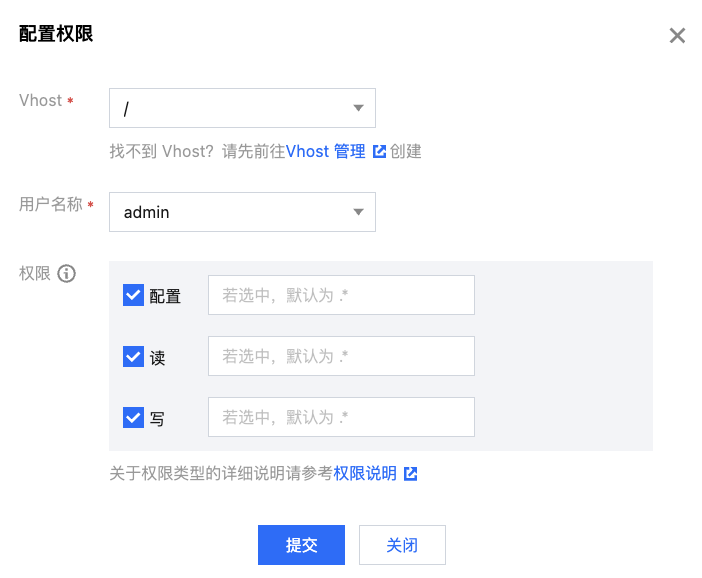 权限指的是用户对该 Vhost 下 Exchange、Queue 的操作权限,包括配置权限,读写权限。