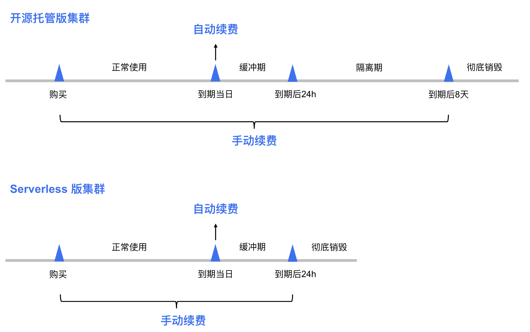 手动续费:包年包月集群自购买到被彻底销毁期间,您可以在任意时间为集群手动续费,以延长集群的使用时间。