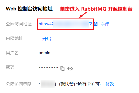 3. 在 Web 控制台访问地址 页面,获取 Web 界面 UI 地址和用户名。您可以使用公网或者内网地址登录 RabbitMQ 开源控制台: