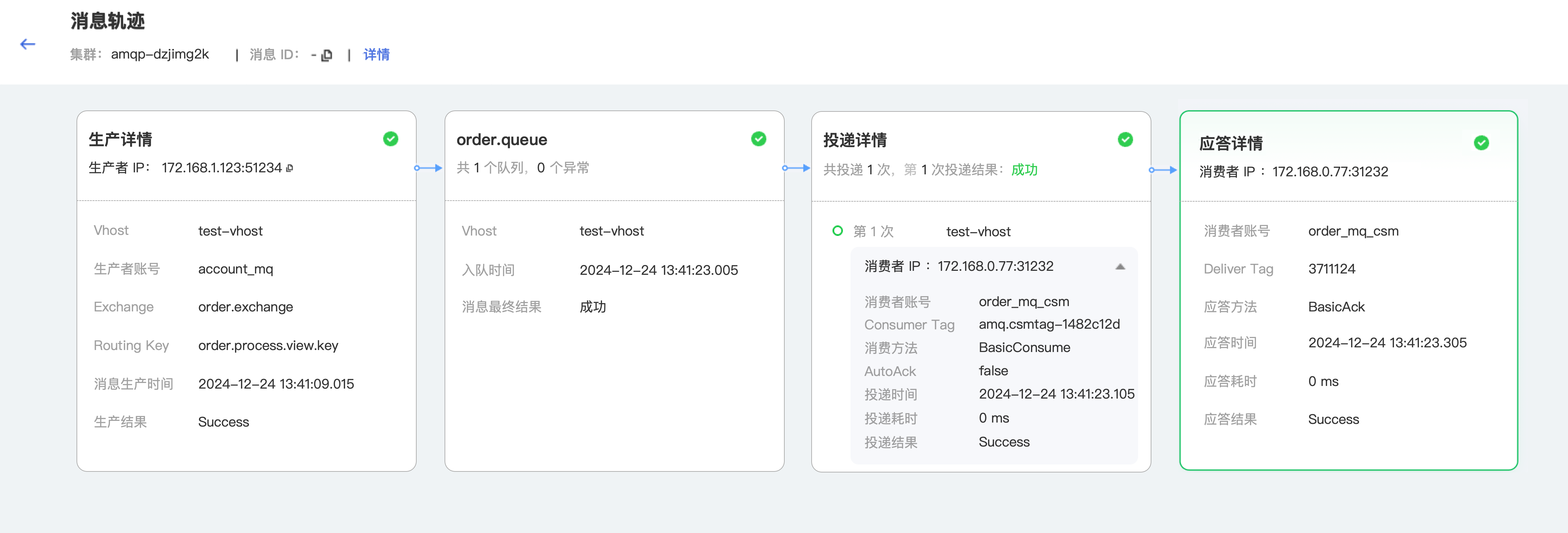 5. 您还可以单击消息轨迹,进一步查看消息的生产、入队、投递、应答的完整生命周期。