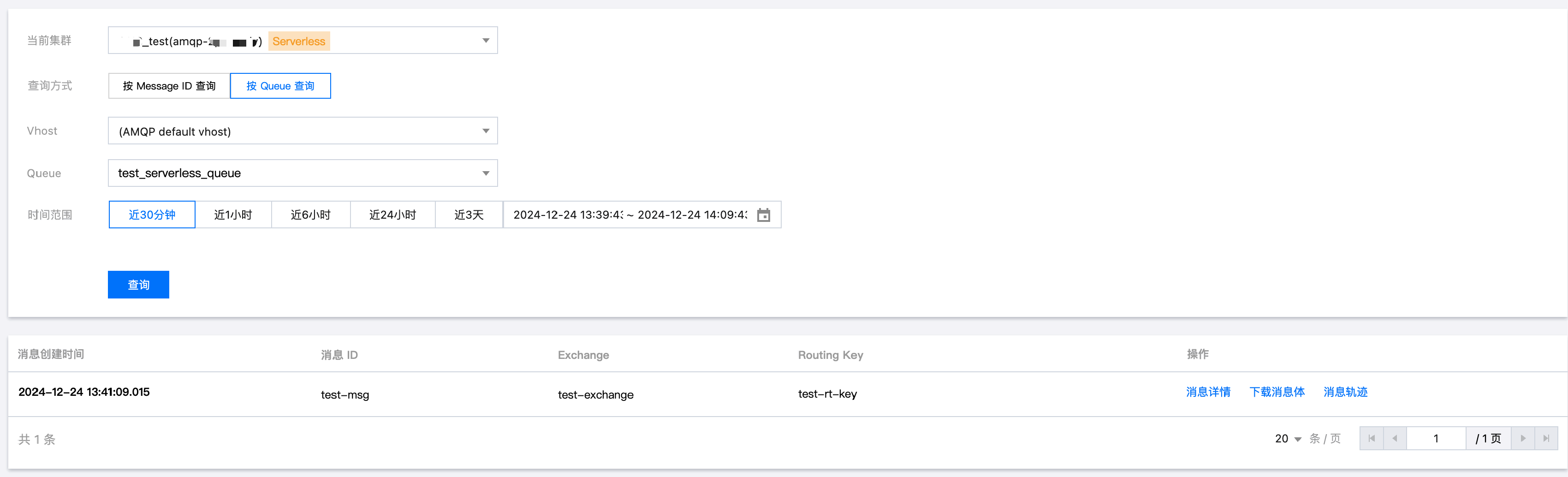 3. 选择需要查询的集群、Vhost、Queue 和时间范围,可以填写 Routing Key、用户、消息的 headers 和 body,进一步缩小查询范围。