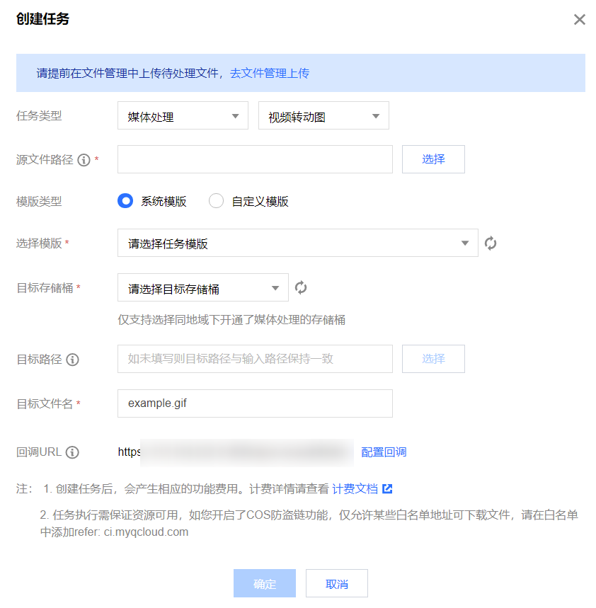 5. 功能类别选择转码处理,任务类型选择视频转动图 ,单击创建任务,按照如下配置项说明配置后,单击确定。