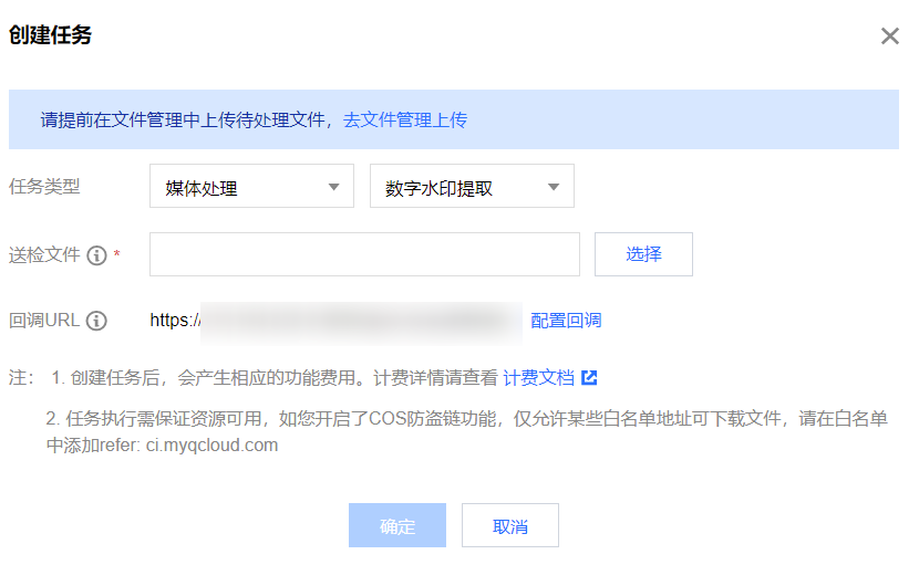 5. 功能类别选择版权保护,任务类型选择数字水印提取,单击创建任务,按照如下配置项说明配置后,单击确定。