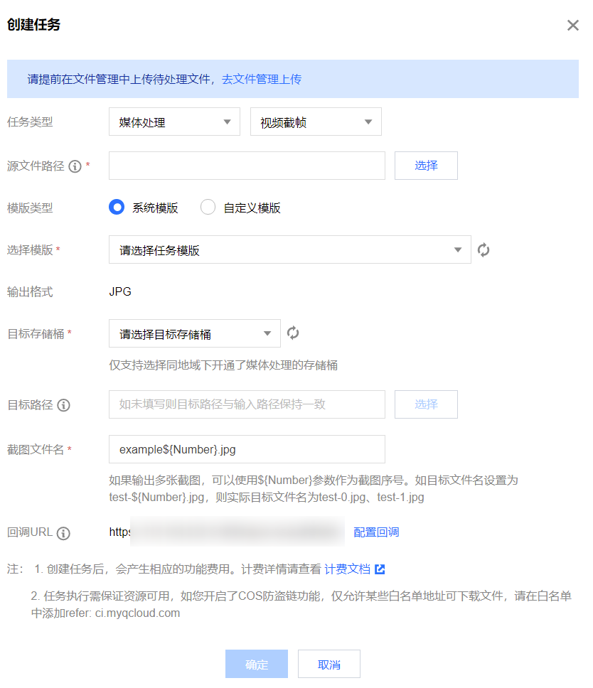 5. 功能类别选择转码处理,任务类型选择视频截帧 ,单击创建任务,按照如下配置项说明配置后,单击确定。