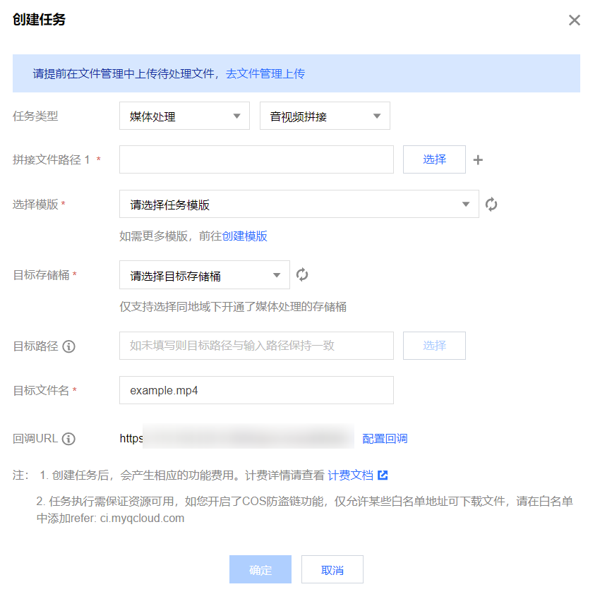 5. 功能类别选择转码处理,任务类型选择音视频拼接 ,单击创建任务,按照如下配置项说明配置后,单击确定。