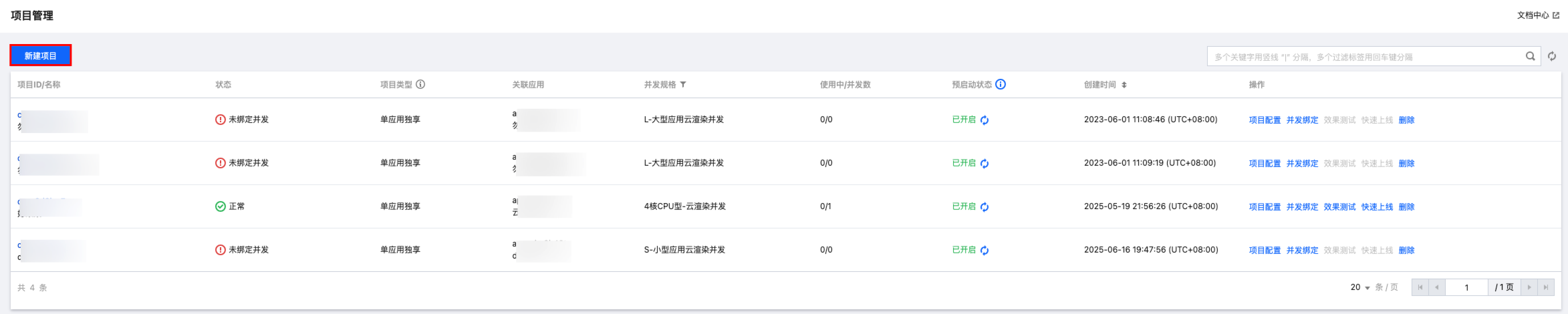 您可以针对一个应用新建多个项目,指定不同规格的并发,从而测试不同规格并发的运行效果。建议您从 L/XL 型开始测试,避免因并发性能不满足应用运行需求而导致卡顿等问题。