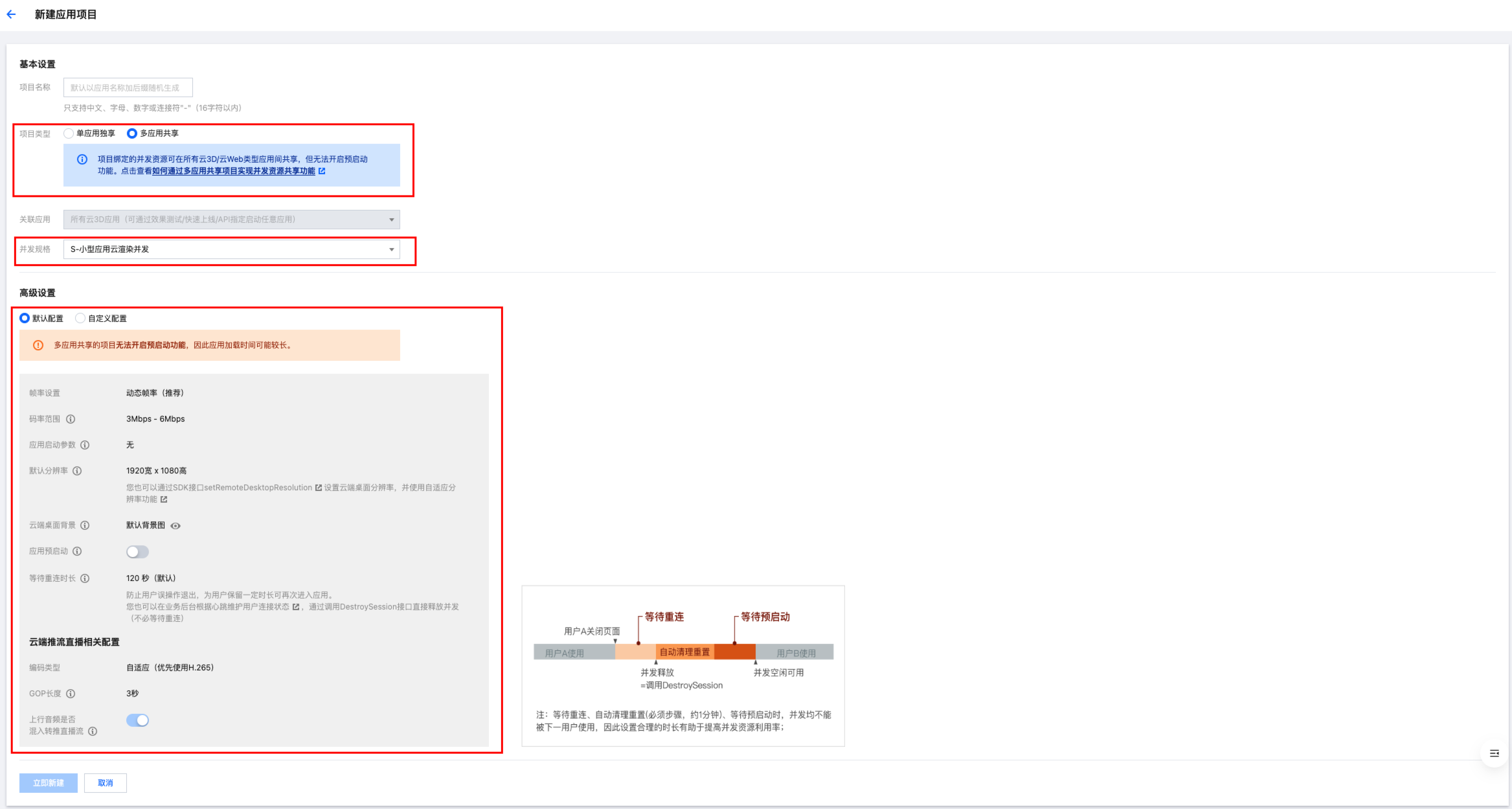 高级设置:项目允许默认配置或自定义帧率、码率范围、默认云端桌面分辨率、应用启动参数、预启动、等待重连时长等参数,您可根据需求调整。