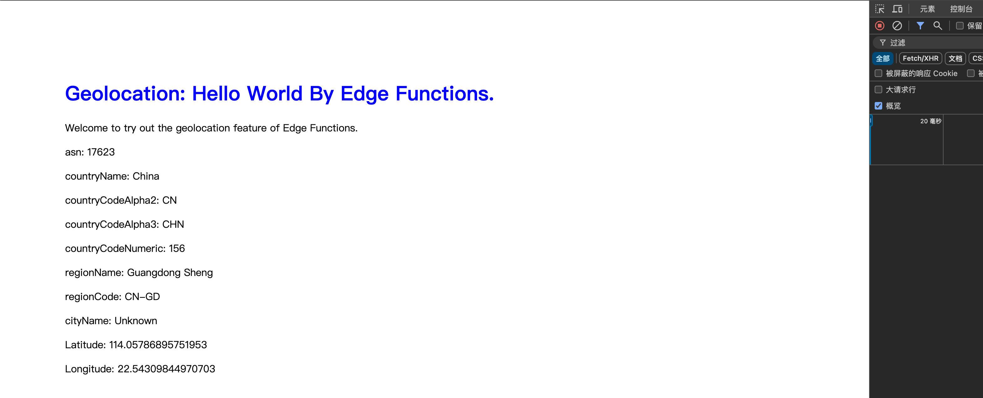 // 添加fetch事件监听器,当有请求进入时触发,使用handleRequest函数处理请求,并返回响应addEventListener('fetch', event => {event.respondWith(handleRequest(event.request));});// 定义一个异步函数handleRequest,用于处理传入的请求async function handleRequest(request) {// 初始化一个空字符串用于存放HTML内容let html_content = "";// 定义HTML的样式let html_style = "body{padding:6em; font-family: sans-serif;} h1{color:#0000ff;}";// 获取用户的地理位置信息html_content += "<p> asn: " + request.eo.geo.asn + "</p>"; // 自治域系统编号html_content += "<p> countryName: " + request.eo.geo.countryName + "</p>"; // 国家名称html_content += "<p> countryCodeAlpha2: " + request.eo.geo.countryCodeAlpha2 + "</p>"; // 国家两字母代码html_content += "<p> countryCodeAlpha3: " + request.eo.geo.countryCodeAlpha3 + "</p>"; // 国家三字母代码html_content += "<p> countryCodeNumeric: " + request.eo.geo.countryCodeNumeric + "</p>"; // 国家数字代码html_content += "<p> regionName: " + request.eo.geo.regionName + "</p>"; // 地区名称html_content += "<p> regionCode: " + request.eo.geo.regionCode + "</p>"; // 地区代码html_content += "<p> cityName: " + request.eo.geo.cityName + "</p>"; // 城市名称html_content += "<p> Latitude: " + request.eo.geo.latitude + "</p>"; // 纬度html_content += "<p> Longitude: " + request.eo.geo.longitude + "</p>"; // 经度// 构建HTML响应内容let html = `<!DOCTYPE html><head><title> Geolocation: Hello World By Edge Functions.</title><style> ${html_style} </style></head><body><h1>Geolocation: Hello World By Edge Functions.</h1><p> Welcome to try out the geolocation feature of Edge Functions.</p>${html_content}</body>`;// 返回一个新的Response对象,包含HTML内容和相应的headersreturn new Response(html, {headers: {"content-type": "text/html;charset=UTF-8", // 设置响应的Content-Type头部,指定返回内容为HTML},});}